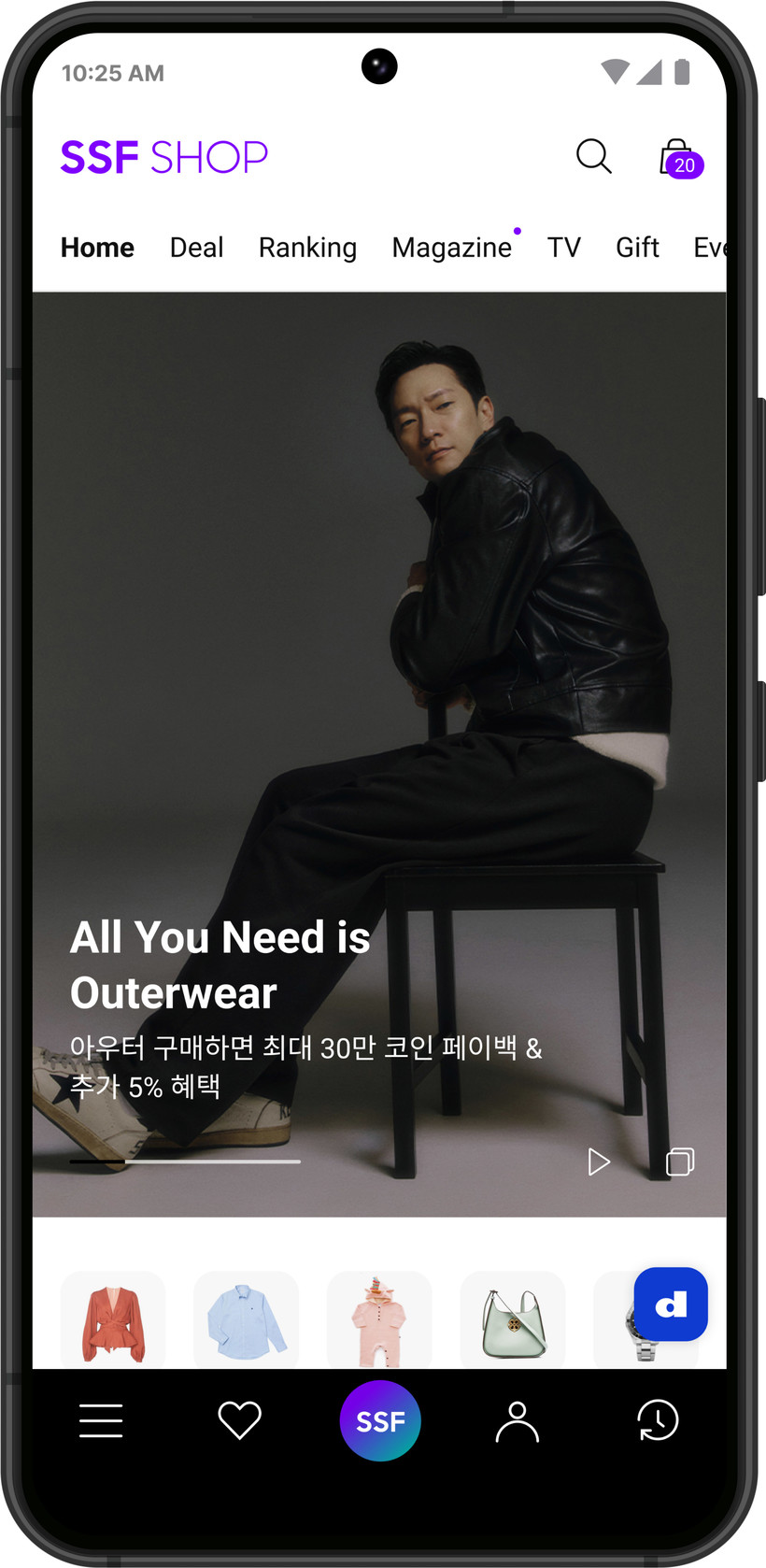 메인 화면은 고객이 SSF숍과의 첫 만남을 인상깊게 느끼도록 마치 패션매장을 구경하는 듯한 동선으로 구성했다. 또 화면을 구성하는 이미지는 더욱 크고 강렬하게 했고, 다양한 콘텐츠를 배치했다.
