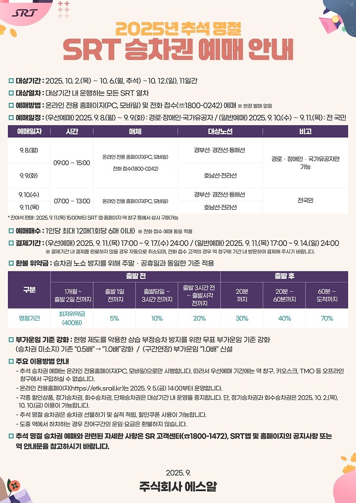 | 추석 명절 SRT 승차권 예매 안내. [사진=에스알] |
