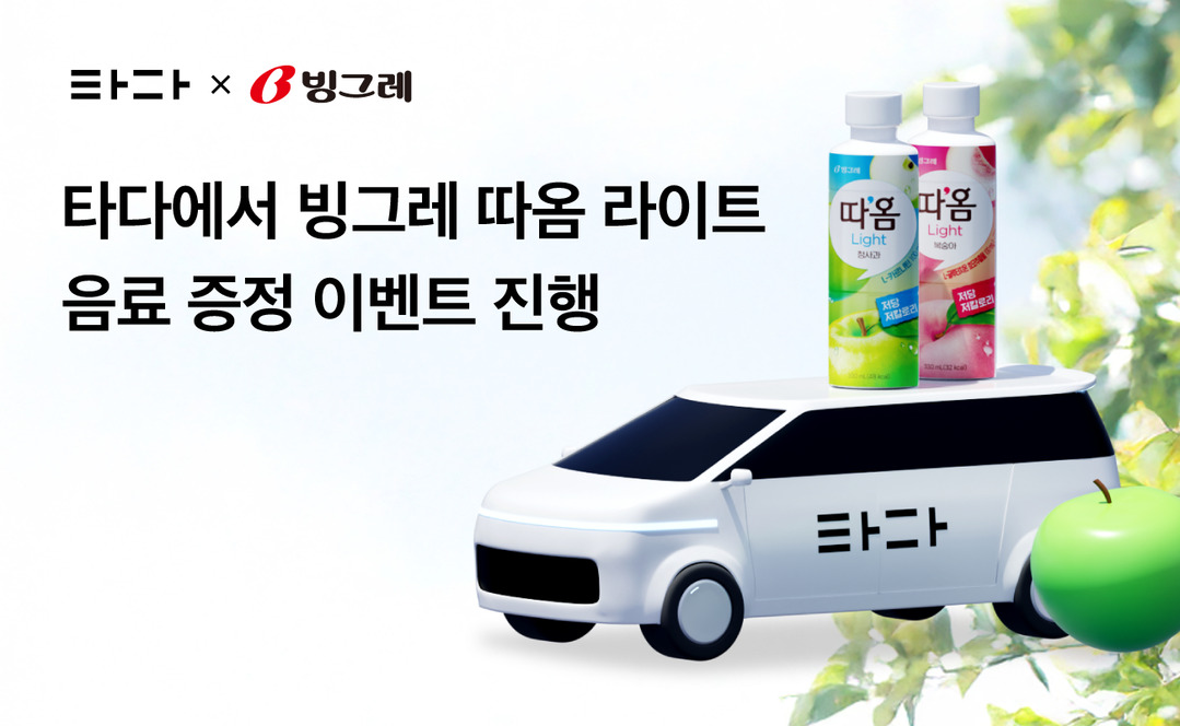 [하비엔뉴스 = 이동훈 기자] 모빌리티 플랫폼 '타다' 운영사 브이씨엔씨(대표 강희수, 이하 타다)가 빙그레와 협업해 타다 넥스트 이용 고객에게 과일 음료를 증정하는 이벤트 ‘타다로 갓따옴’을 진행한다고 13일 밝혔다.