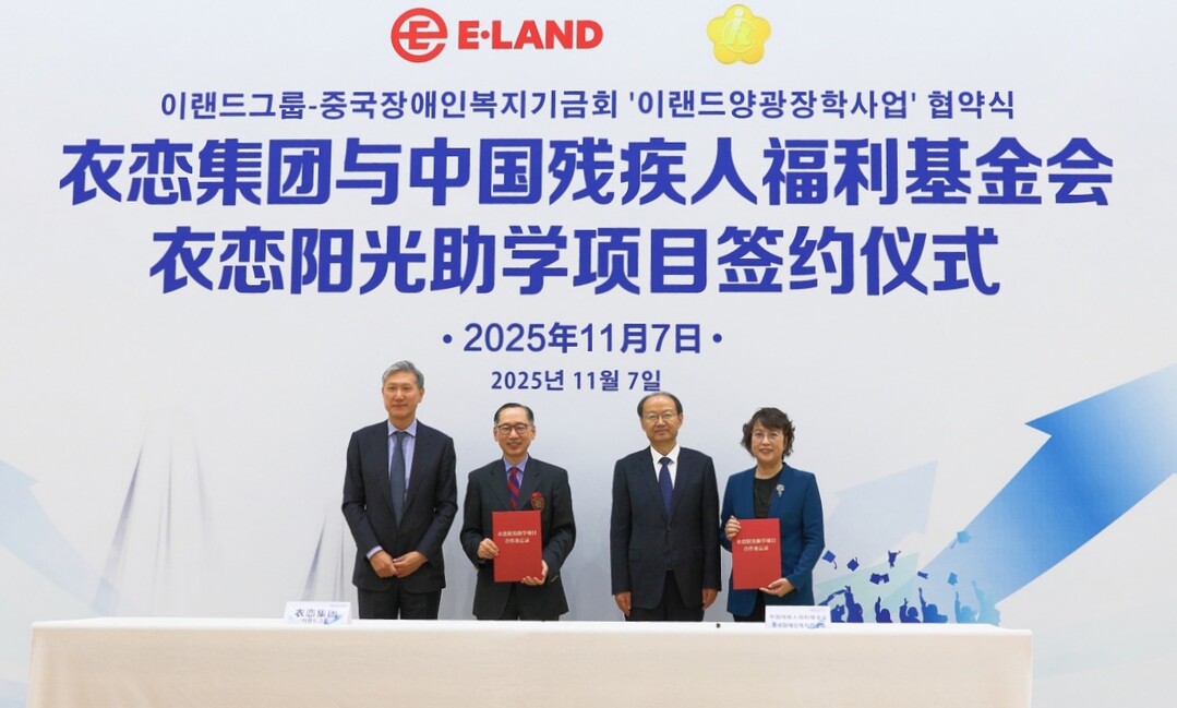 [HBN뉴스 = 김혜연 기자] 이랜드그룹(부회장 최종양)은 11월 7일 베이징 중국장애인연합회 본부에서 중국장애인복지기금회(이사장 자오수징)와 장애인 가정 청소년을 위한 10년 장학 지원 협약을 체결했다. 이번 협약은 이랜드가 중국에서 운영해 온 ‘양광장학사업’의 지원 대상을 2024년부터 ‘장애인 가정 고등학생’으로 전환한 체계를 공식화하고, 한·중 공공–기업 협력의 대표 사회공헌 모델로 발전시키기 위해 마련됐다.