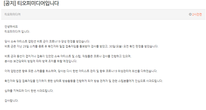 30일 소속사 티오피미디어는 공식 홈페이지를 통해 "비토가 29일 스케줄 종료 후 확진자와 밀접 접촉자임을 통보받아 검사를 받고 30일 오전 확진판정을 받았다"고 밝혔다.