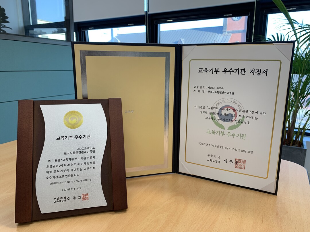 | 교육기부 우수기관 지정서 [사진=한국식품안전관리인증원] |
