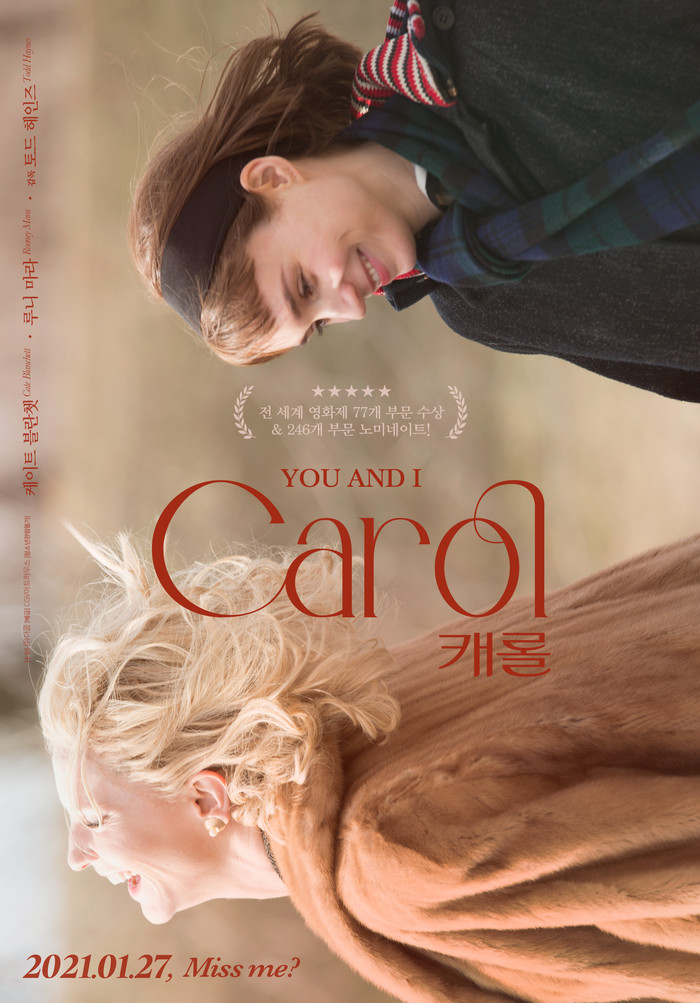 1950년대 뉴욕, 백화점 장난감 코너에서 일하는 테레즈(루니 마라)는 딸의 크리스마스 선물을 사기 위해 백화점을 찾은 캐롤(케이트 블란쳇)을 처음 만나 운명적인 끌림을 느낀다. 테레즈는 캐롤이 두고 간 장갑을 돌려주면서 함께 점심을 먹게 되고, 이를 계기로 조금씩 가까워진다. 남편과의 이혼 소송으로 지쳐있던 캐롤은 테레즈에게 함께 여행을 떠날 것을 제안하고, 둘은 함께 차를 타고 뉴욕을 떠나 서부로 향하기 시작한다. <캐롤>은 타임스가 선정한 20세기 100대 소설 중 하나인 패트리샤 하이스미스의 자전적 소설 <소금의 값>을 원작으로 한 작품으로, 케이트 블란쳇과 루니 마라의 섬세한 감정선과 아름다운 로맨스가 돋보인다. 탄탄한 스토리에 더해 미술, 촬영, 의상, 음악까지 작품의 완성도를 인정받아 제68회 칸 국제영화제에서 여우주연상과 퀴어종려상을 수상했다.