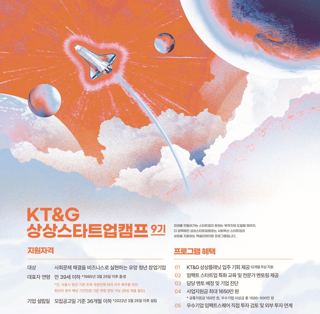 모집 대상은 창업한 지 3년 이내 초기 스타트업 청년 창업가로, KT&G는 총 20개의 청년 창업팀을 선정해 약 5개월간 전문가 멘토링과 역량강화 교육을 제공한다. 참가 신청은 KT&G 상상플래닛 홈페이지에서 접수받는다.