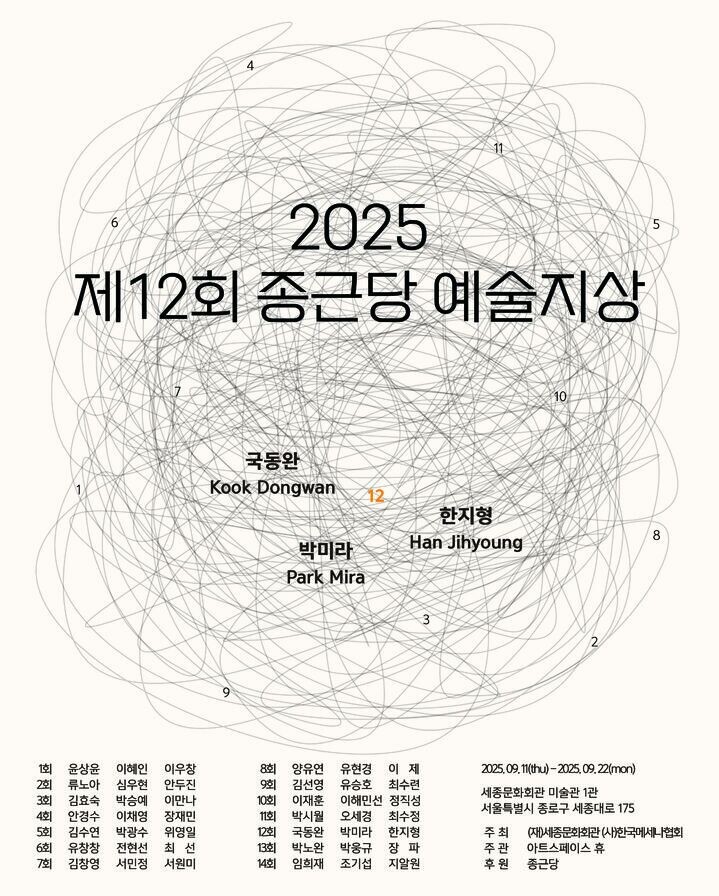 [HBN뉴스 = 허인희 기자] 종근당홀딩스는 오는 11일부터 22일까지 서울 종로구 세종문화회관 미술관 1관에서 '제12회 종근당 예술지상 기획전'을 개최한다고 10일 밝혔다.