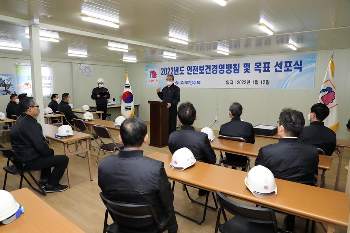[하비엔=홍세기 기자] 부영그룹이 현장 근로자 안전관리 및 안전보건경영 강화에 최우선에 둔 ‘2022년도 안전보건경영방침 및 목표’를 수립했다. 최양환 대표이사 및 임직원들은 지난 12일 서울 용산한강로 3가 소재 부영아파트 신축공사 현장에서 안전경영 실천 의지를 높이기 위한 ‘2022년도 안전보건경영방침 선포식’ 행사를 가지기도 했다.