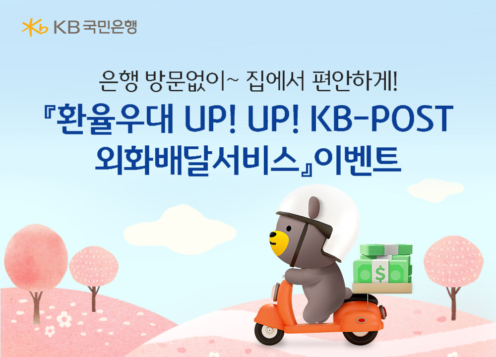[하비엔뉴스 = 송현섭 기자] KB국민은행은 ‘KB-POST외화배달서비스’ 환율 우대율 리뉴얼을 기념해 오는 5월말까지 경품을 증정하는 이벤트를 진행한다고 27일 밝혔다.