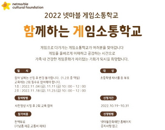 참가 신청은 오는 31일까지 넷마블문화재단 홈페이지 내 공지를 통해 가능하다. 기존 ‘찾아가는 게임소통학교’ 교육을 수료한 학부모를 비롯해 게임소통에 대한 이해가 있는 초등학교 학부모는 누구나 신청 가능하고, 참가 여부는 개별로 안내될 예정이다,