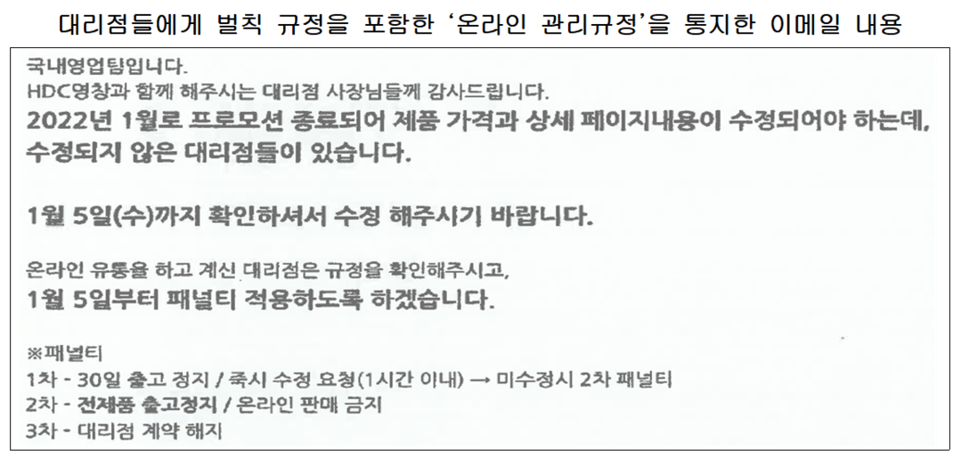 | 에이치디씨영창이 대리점들에게 보낸 온라인 관리규정 통보 이메일 내용. [자료=공정거래위원회] |