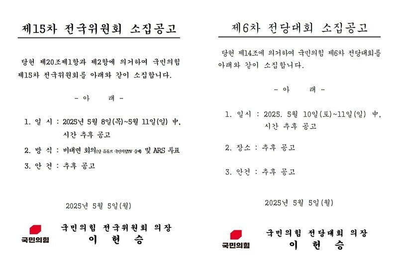 | 사진=국민의힘 지도부는 오는 8∼9일 전국위원회와 10∼11일 전당대회를 개최한다는 공고문 |