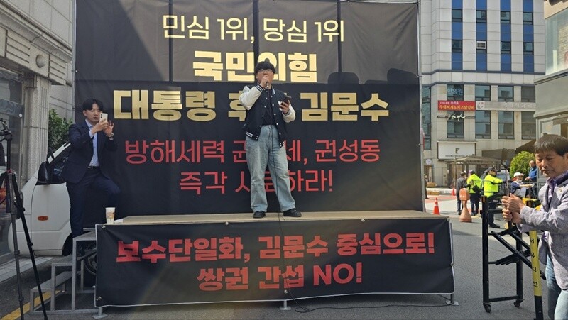 | 사진= 6일(화) 오전 9시 국민의힘 당사앞에서 긴급 기자회견 및 집회를 하고있다。 [제공/김문수 지지단체] |