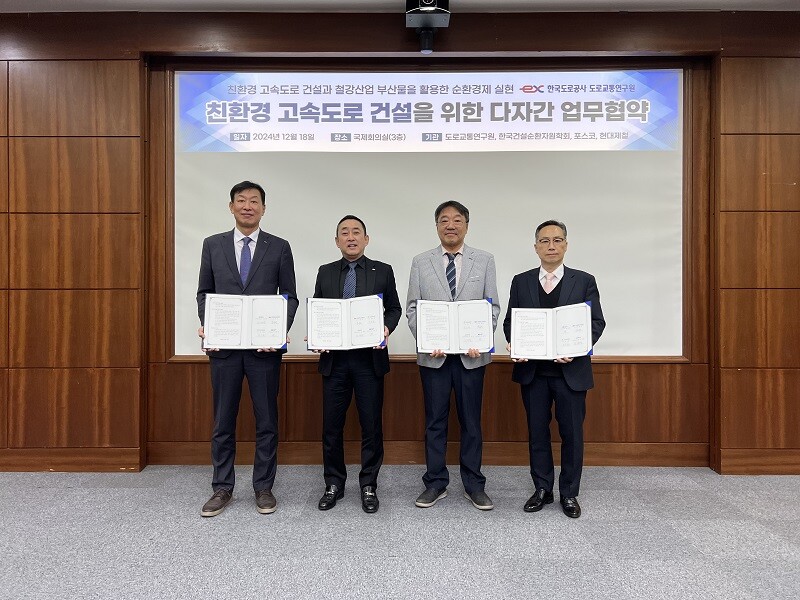 [하비엔뉴스 = 홍세기 기자] 한국도로공사는 18일 동탄에 위치한 도로교통연구원에서 한국건설순환자원학회, 포스코, 현대제철과 친환경 고속도로 건설 및 순환경제 실현을 위한 산학연 다자간 업무협약을 체결했다고 밝혔다.