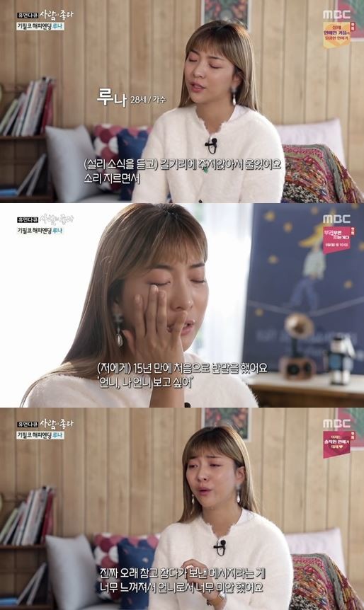지난 3일 방송된 MBC '휴먼다큐 사람이 좋다'에는 루나가 출연해 지난해 안타깝게 세상을 떠난 설리에 대해 언급했다.
