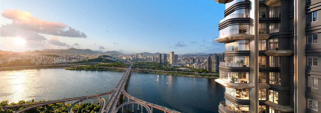 거실 기둥을 생략하고 프레임 없는 광폭 창호를 적용한 '라운드 코너 아이맥스 윈도우'를 통해 세대당 평균 20.5m 폭의 270도 파노라마 한강 조망을 계획했다.