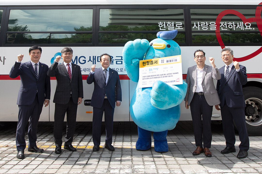 | 새마을금고중앙회 임원 및 새마을금고 브랜드캐릭터 블루대장이 헌혈캠페인 참여 후 헌혈을 독려하는 기념촬영을 하고 있다. (왼쪽부터) 임진우 새마을금고중앙회 신용공제 대표이사, 황길현 새마을금고중앙회 전무이사, 김인새마을금고중앙회장, 최훈 새마을금고중앙회 지도이사, 강왈구 새마을금고중앙회 감사위원장 [사진=새마을금고중앙회] |
