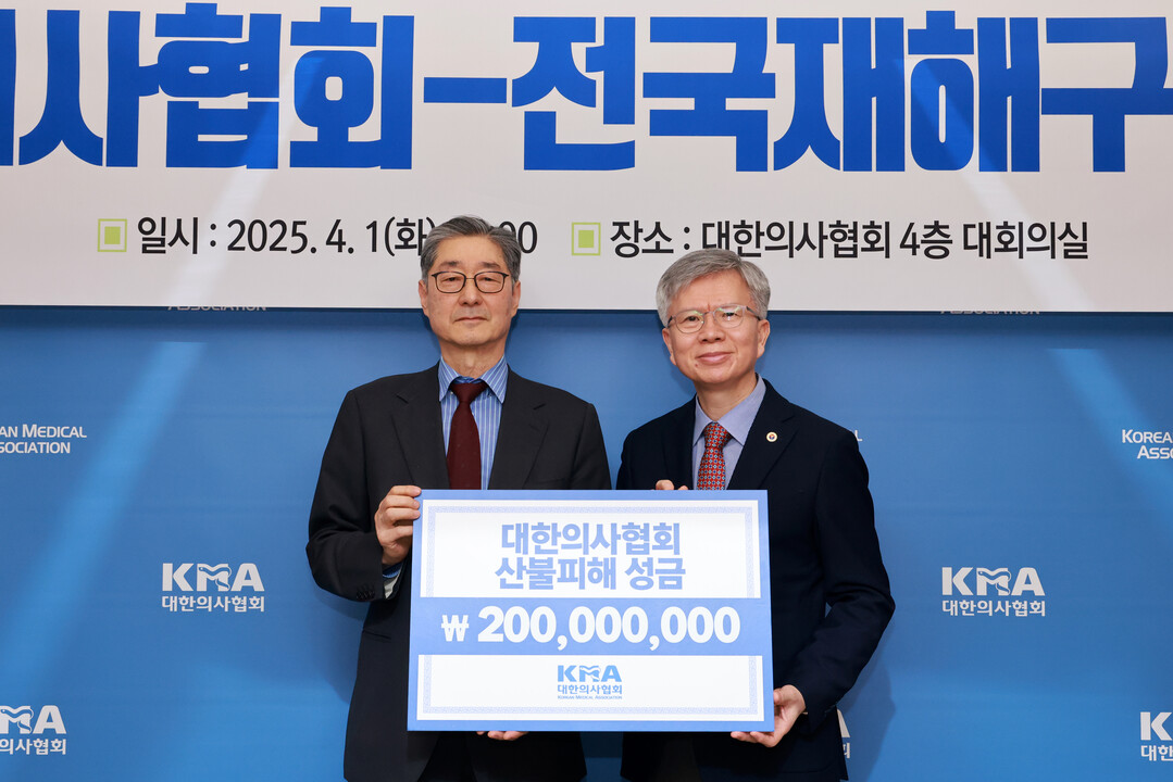 대한의사협회는 또 산불 피해 지역 복구를 위해 성금 2억원을 희망브리지에 전달했다. 기부금은 피해 주민의 건강 보호와 심신 회복을 위한 의료지원, 생계지원, 임시 대피소 운영 등에 사용될 예정이다.
