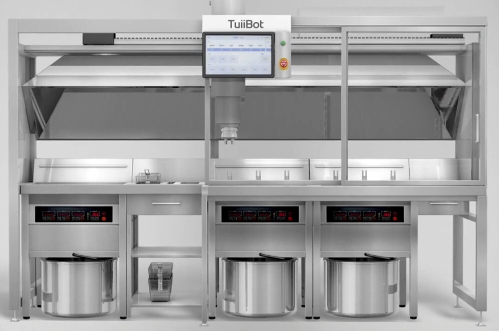 ‘튀봇’은 반죽된 재료를 기계에 올리면 로봇이 트레이를 움직여 조리하는 튀김요리 제조용 로봇으로, 사전에 입력한 레시피를 기반으로 일정한 맛을 유지하고 일체형 후드·안전펜스로 조리과정 중 발생할 수 있는 사고를 예방한다.