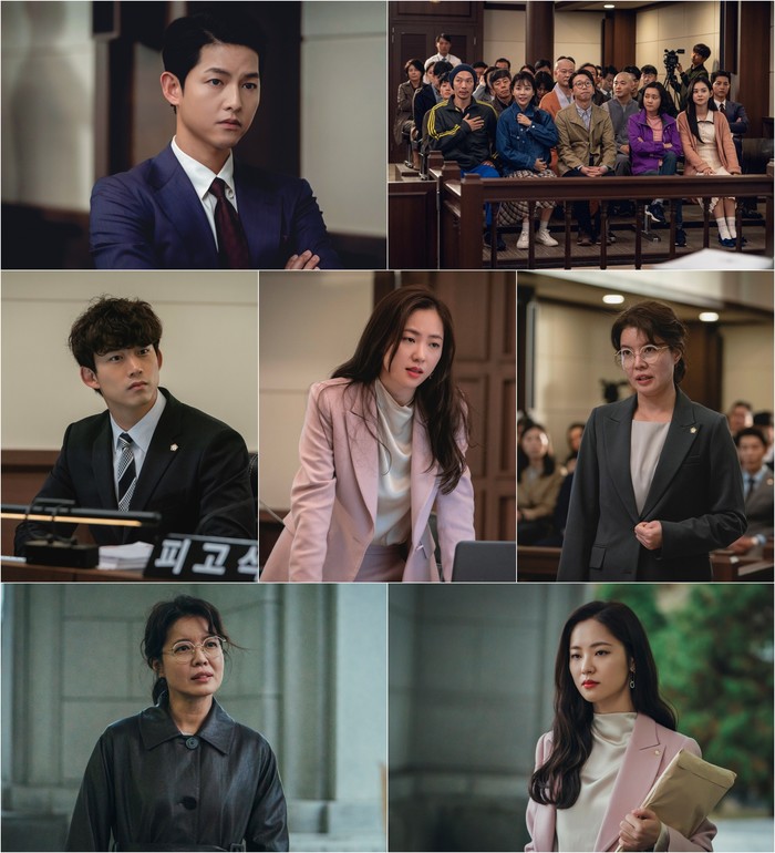 그런 가운데 공개된 사진 속, 팽팽한 접전이 벌어지는 법정 풍경이 흥미를 한껏 끌어올린다. 먼저 홍차영의 진지한 모습이 눈길을 끈다. 그가 한때 몸담았던 우상을 향해 독종의 참맛을 보여줄 수 있을지 기대가 쏠린다. 참관석에 앉은 빈센조는 예리한 눈빛으로 상황을 지켜보고 있다. 금가프라자 패밀리의 다이내믹한 표정은 흥미진진한 법정 공방을 예고한다. 변론을 펼치는 최명희(김여진 분)를 예의주시하는 바벨의 진짜 회장 장준우(옥택연 분)의 모습도 시선을 사로잡는다. 법정에 들어가기 전부터 살벌한 신경전을 펼쳤던 ‘독종’ 홍차영과 ‘독사’ 최명희. 승소를 위해서라면 물불 가리지 않는 두 사람의 팽팽한 접전이 기대를 높인다.