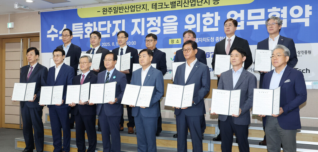 [하비엔뉴스 = 이수준 기자] 전북특별자치도는 5일 도청 종합상황실에서 완주군, 현대자동차 전주공장, 한국수소연합, 전북대 등 16개 기관과 완주 수소특화단지 지정 공모 대응을 위한 업무협약을 체결하고 수소모빌리티 산업의 글로벌 허브로 도약하기 위한 완주 수소특화단지 조성에 본격 나섰다.