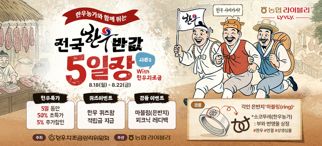 [하비엔뉴스 = 홍세기 기자] 농협경제지주가 운영하는 축산물 전문 온라인쇼핑몰 농협라이블리가 한우자조금관리위원회와 공동으로 18일부터 22일까지 '전국 한우 반값 5일장'을 개최한다.