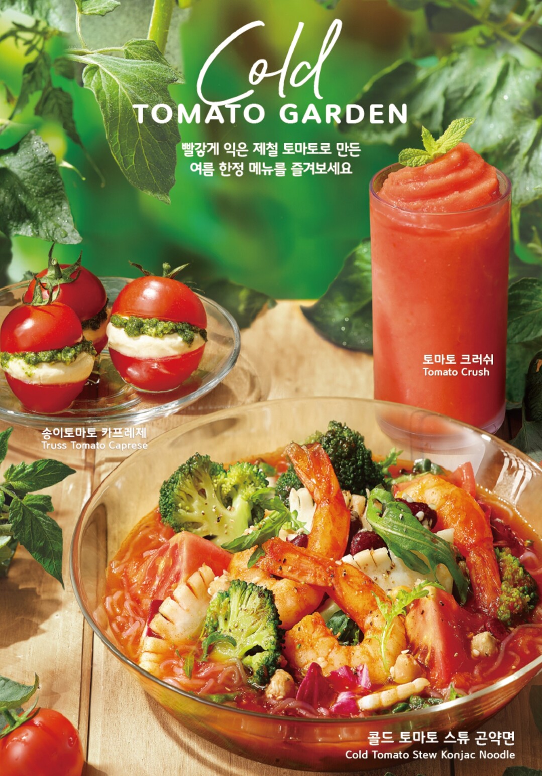 신메뉴는 ▲차가운 토마토 스튜에 저칼로리 곤약면과 야채, 해산물을 등을 넣어 만든 ‘콜드 토마토 스튜 곤약면’ ▲송이토마토에 크림치즈, 바질 페스토를 올린 ‘송이토마토 카프레제 스쿱 샐러드’ ▲토마토와 오이, 바질을 넣어 시원하게 즐기는 ‘콜드 토마토 스프’가 있다.