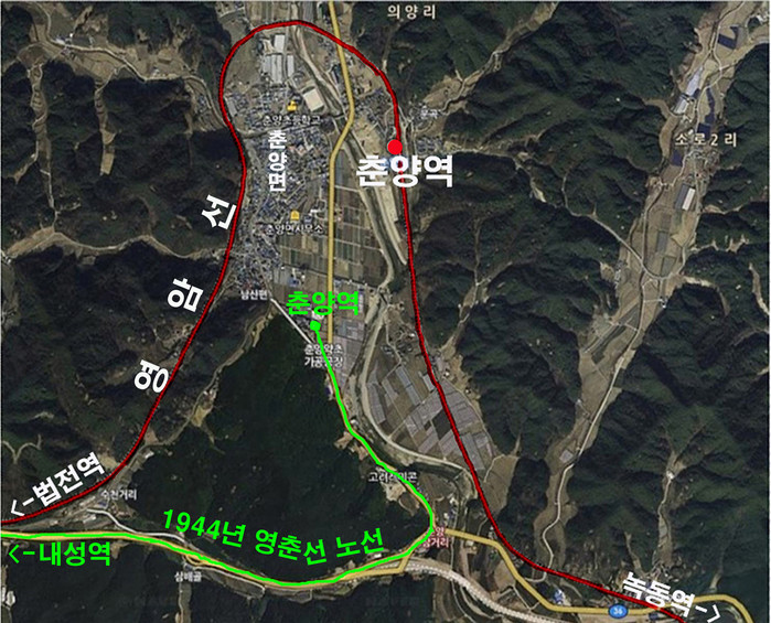 영암선 춘양역은 조선철도주식회사가 1944년10월16일 영주~춘양 간 35.2㎞에 궤간 1,435㎜의 철도부설을 허가받았으며(1944.11.01.관보 5324호), ‘조선철도사’에 소개된 1945년 8월15일 현재 ‘조선철도일현표’에 영춘선 영주~내성 간 14.3㎞가 개업선으로, ‘조선철도약도’에는 내성~춘양 간 은 미 개업 선으로 기록되어 영춘선 공사가 진행도중 중단되었던 사실을 확인할 수 있다.