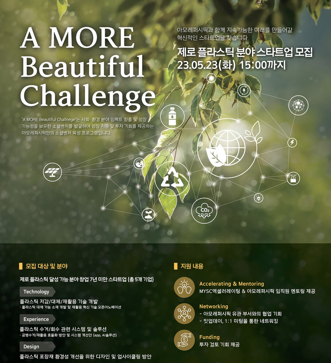 아모레퍼시픽이 주관하고 임팩트 투자사 엠와이소셜컴퍼니(MYSC)가 운영하는 ‘A MORE Beautiful Challenge’는 환경·사회 분야 스타트업을 발굴해 아모레퍼시픽과의 협업·투자를 연계하는 프로그램이다.