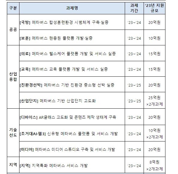 | ▲2023년 메타버스 선도프로젝트 신규과제 공모 개요.[사진=과기정통부] |
