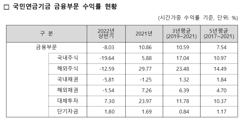 국민연금공단에 따르면, 자산별 수익률(금액가중수익률 기준)은 국내 주식 –19.58%, 해외 주식 –12.59%, 국내 채권 –5.80%, 해외 채권 –1.55%, 대체투자 7.25%로 나타났다.