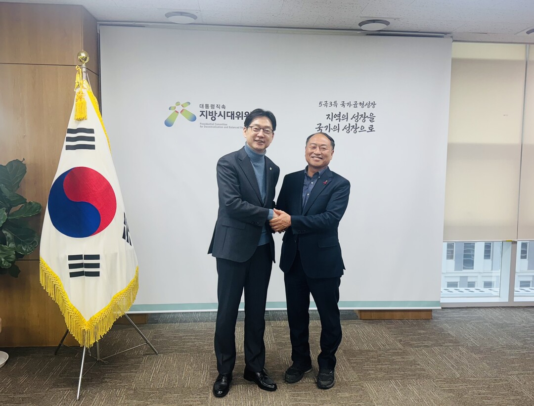 [HBN뉴스 = 이수준 기자] 한득수 더불어민주당 전북기본사회위원회 부위원장이 15일 오전 (세종특별자치시 지방시대위원회)에서 김경수 대통령직속 지방시대위원장을 만나 임실군의 현실을 공유하고, 지방소멸대응을 위해 지역 특성에 맞는 자립모델을 발굴하자고 제안했다.