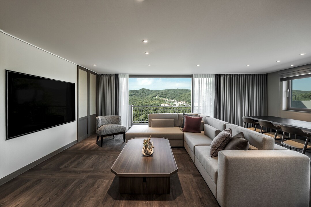 객실 디자인은 한국의 전통 미술품인 ‘달항아리’와 ‘부채’를 모티브로 현대적인 인테리어에 접목시켜 고급스러우면서도 편안한 분위기로 연출됐다. 풍요와 복을 상징하는 달항아리의 유려한 곡선과 백자의 은은한 색감, 한국의 멋과 여유를 담은 부채의 섬세한 디자인이 객실 전체 분위기를 품격 있게 연출한다. 또한, 8층 높이에서 조망하는 파노라마 자연 경관은 객실의 또 다른 핵심 요소로 고객에게 차별화된 경험을 제공한다.