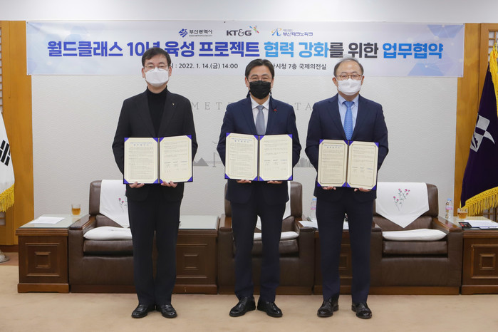 KT&G는 지난 14일 부산시청 국제의전실에서 부산광역시·부산테크노파크와 ‘월드클래스 10년 프로젝트’ 업무협약을 체결했다고 밝혔다.