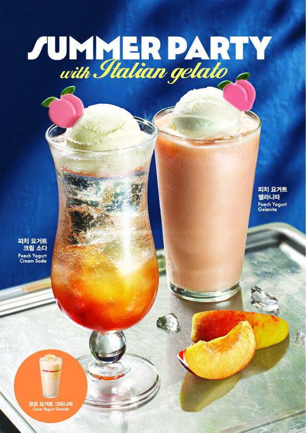 우선 시즌 음료인 ‘피치 요거트 젤라니따’는 요거트 젤라또와 복숭아를 얼음과 함께 갈아 넣었고, ‘피치 요거트 크림소다’는 복숭아 스파클링에 요거트 젤라또를 얹어 청량한 맛을 극대화한 제품이다.