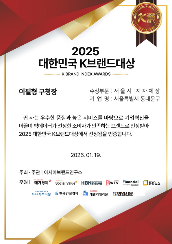 이필형 동대문구청장은 “‘2025 대한민국 K브랜드대상’ 수상자로 선정된 것에 대해 깊이 감사드립니다. 이번 수상은 어느 한 사람의 성과가 아니라, 매일의 불편을 함께 찾고 하나씩 개선해 온 구민 여러분과 현장에서 땀 흘린 동대문구 공직자·협력 기관·지역사회가 함께 만들어낸 결과라고 생각합니다. ‘브랜드’는 결국 이름이 아니라 신뢰이고, 신뢰는 구민의 일상에서 ‘정말 달라졌다’는 체감으로 완성됩니다”라고 전했다.