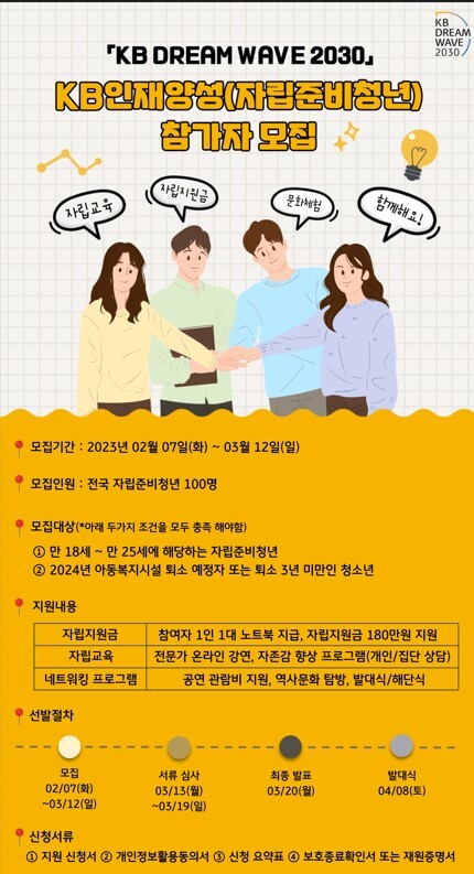 자립준비청년은 만 18세로 복지시설 등을 떠나 사회에서 독립해야 하는 청년을 말한다. KB국민은행은 ‘KB Dream Wave 2030’ 캠페인의 일환으로 사회에 첫걸음을 내딛는 자립준비청년의 안정적인 정착을 지원하는 사회공헌 활동을 펼치고 있다.