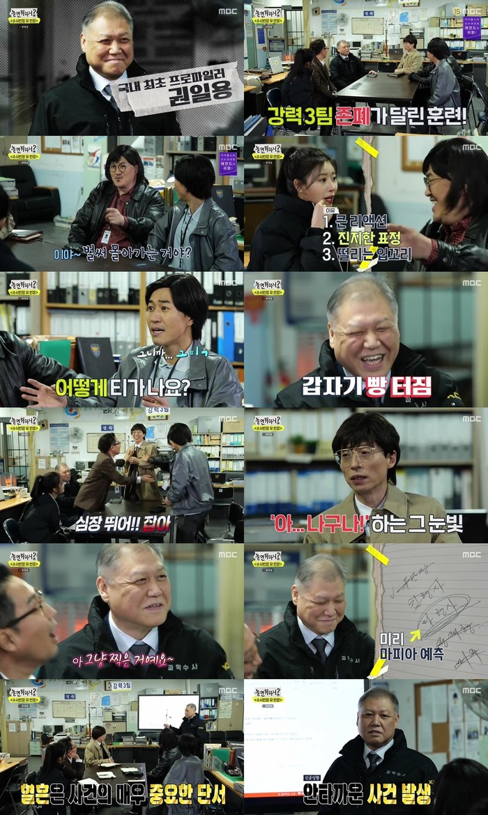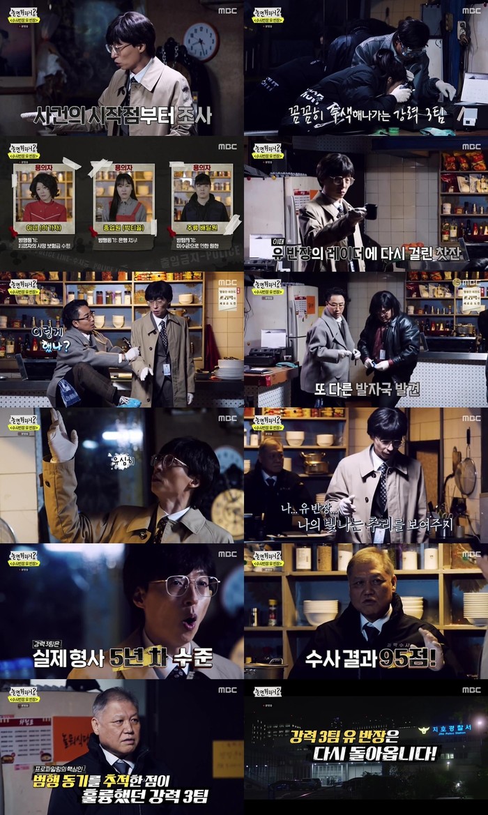 이날 방송에선 ‘놀뭐식당’ 살인사건에 투입된 강력3팀의 활약이 공개됐다. 가게주인 김불통이 살해된 가운데 아내, 종업원, 주류배달원이 용의자로 떠올랐다. 강력3팀은 각기 다른 발자국과 술병에 남아있는 지문, 현장에 흩어져 있는 다양한 증거들을 예리하게 포착하며 사건의 진실을 찾아갔다. 실수도 있었지만 예리한 눈썰미와 추리로 점점 중요한 포인트들을 짚어냈다. 결정적으로 유 반장은 주변에 있는 혈흔의 방향을 주시하며 날카로운 추리력을 발휘했고 결국 강력3팀은 범인과 사건의 진실에 다다랐다.