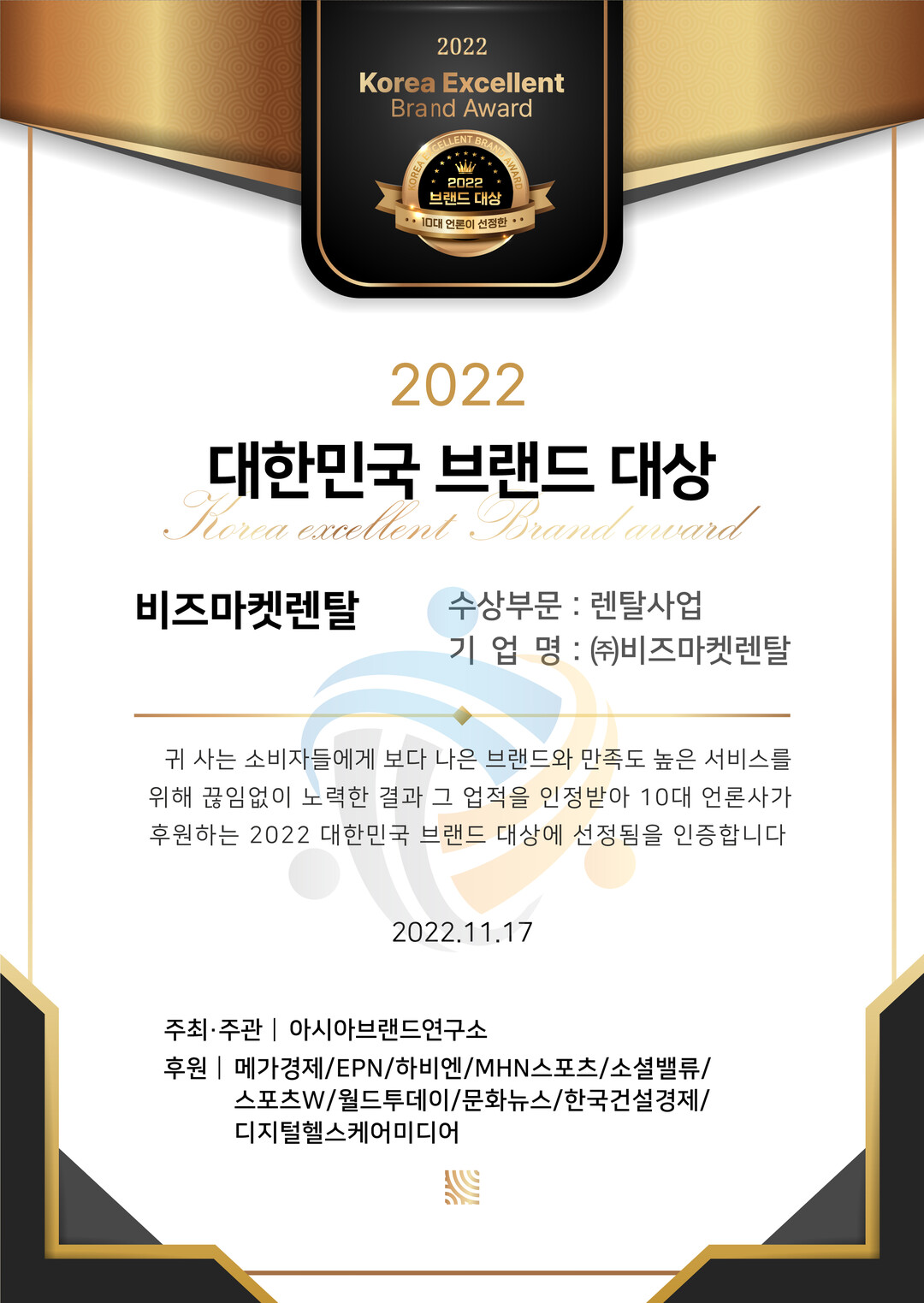 | ▲ 비즈마켓렌탈이 ‘2022 대한민국 브랜드대상’에서 렌털사업 부문 우수 브랜드에 선정됐다. |