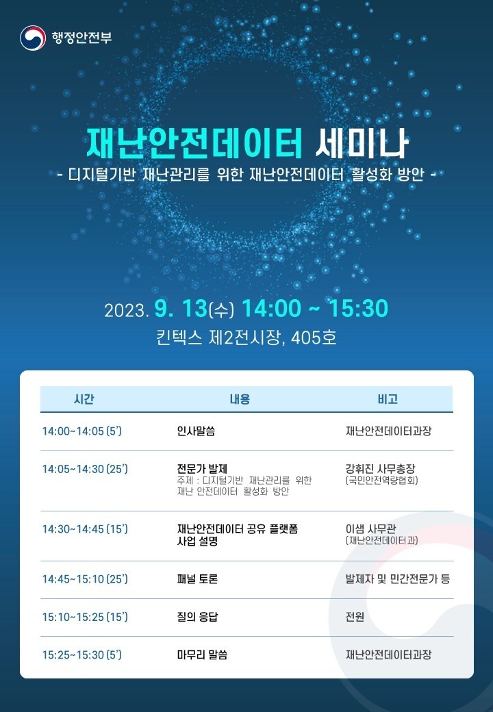 | 행정안전부가 오는 13일 일산 킨텍스 제2전시장에서 ‘제1회 재난안전데이터 세미나’를 개최한다. |