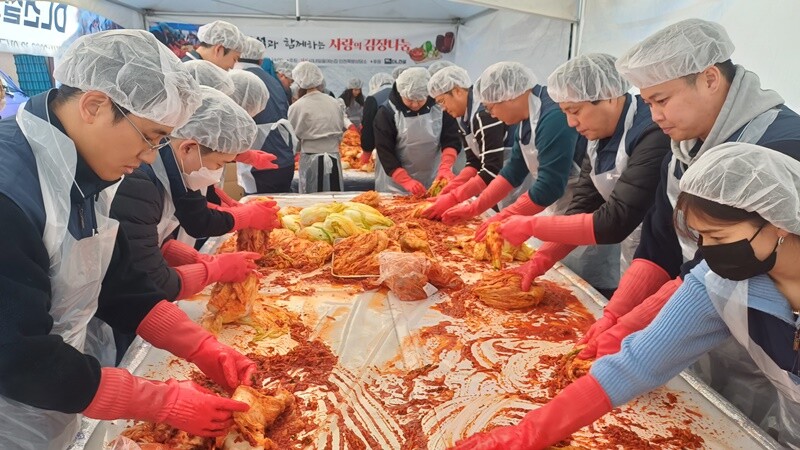 | 이달 초 인천 만석동에 위치한 괭이부리말 인천쪽방상담소에서 DL건설 직원들이 김장 김치를 직접 담그고 있다.[사진=DL건설] |