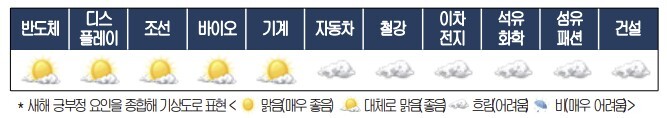 반면 올해 하반기 수출 상승세에 힘입어 ‘대체로 맑음’이었던 자동차·이차전지·섬유패션 업종은 내년에는 ‘흐림’으로 예보됐다.