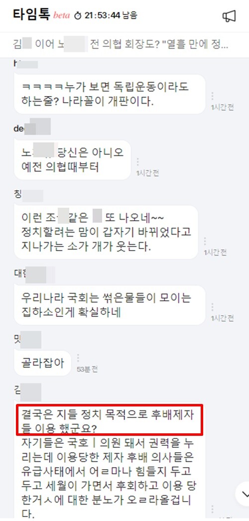 이같은 노 전 회장의 정치 참여 논란 속에 오는 18일이면 전공의가 사직서를 제출한지 한 달이 되는 날로 법률상 이들 전공의들의 사직이 인정되는 날이자 전공의가 복귀해 정상적으로 그동안의 수련을 이어갈 수 있는 마지막 날자를 앞둔 상황에 노 전 회장의 뜬금없는 정치 참여 SNS공유 글을 두고 일부 대형 포털에서는 네티즌들의 비난성 댓글도 이어졌다.