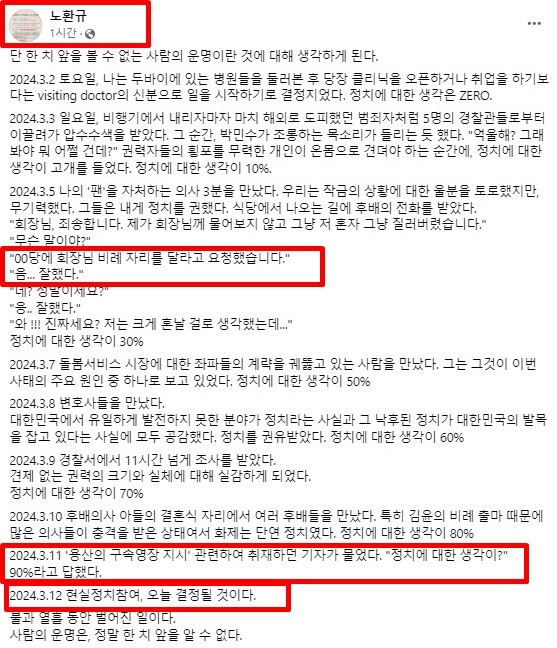 이어 노 전 회장은 "11일 '용산의 구속영장 지시' 관련하여 취재하던 기자가 물었다. "정치에 대한 생각이?" 90%라고 답했다."라는 메시지를 SNS에 공유 하기도 했다. 마지막으로 "12(일) 현실정치 참여 오늘 결정될 것이다"라는 글이 SNS에 공유 됐다.