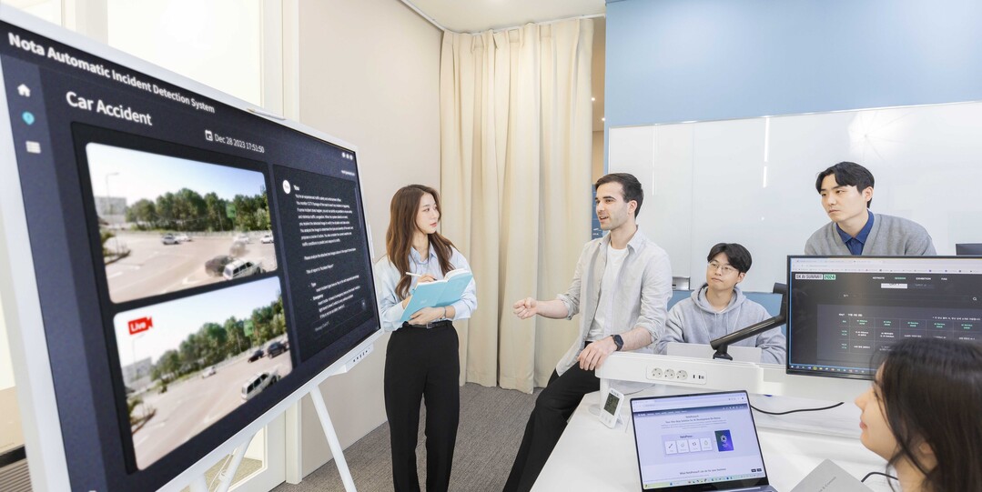 | K-AI 얼라이언스 멤버사인 노타AI 관계자들이 ‘SK AI 서밋 2024’ 참가를 앞두고 논의하고 있다. [사진=SK텔레콤] |