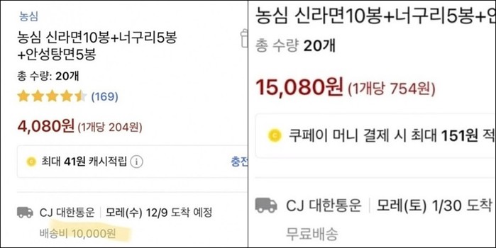 해당 상품 페이지에 노출된 가격은 총 4080원으로 라면 한 봉당 204원에 불과했지만 배송비가 무려 1만원으로 책정돼 있었다.