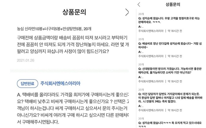 소비자들의 문의가 올라오자 해당 업체의 CS팀에선 답변으로 “그럼 구매하지 마세요”, “배송비 싼 데서 구매하세요” 등 소비자를 우롱하는 듯한 이해하기 어려운 응대를 했다.
