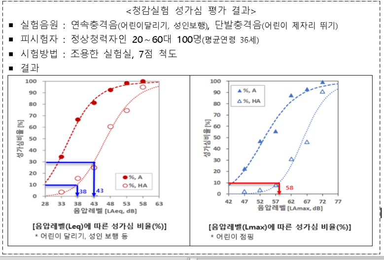 실제 환경부 산하 기관인 한국환경공단이 2019년 12월부터 2020년 6월까지 20~60대 국민 100명을 대상으로 ‘실생활 층간소음 노출 성가심 반응 연구’를 실시한 결과 현 주간 층간소음 기준(1분 등가소음도)인 43dB에서는 청감 실험 대상자의 30%가 ‘매우 성가심’을 느끼는 것으로 조사됐다.