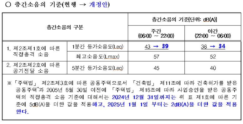 개정안은 현재 주간 43데시벨(dB), 야간 38dB인 직접충격소음 기준(1분 등가소음도)을 주간 39dB, 야간 34dB로 각각 4dB씩 강화한다는 내용을 담았다.