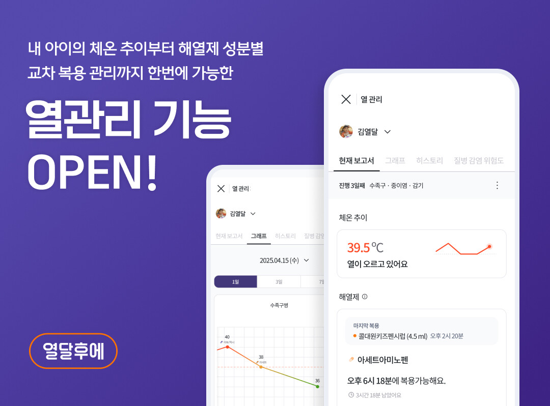 ‘열달후에’의 ‘열관리’ 기능은 아이가 열이 날 때 보호자가 체온과 해열제 복약 이력을 앱에 기록하면 이를 바탕으로 향후 열이 날 때 언제 어떤 성분의 약을 얼마나 복용해야 하는지를 푸시 알림이나 구체적인 가이드를 통해 명확하게 안내해 주는 것이 핵심이다.