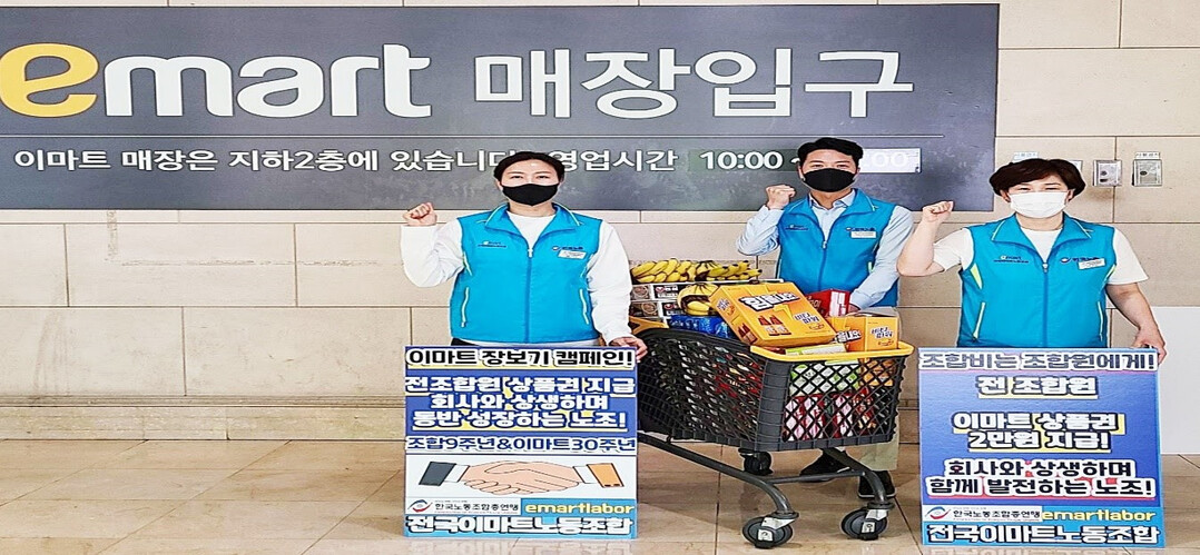 | 한국노총 전국이마트노동조합이 조합 창립 9주년과 이마트 창립 30주년을 맞아 ‘이마트 장보기 캠페인’을 진행했다. [사진=한국노총 전국이마트노동조합] |