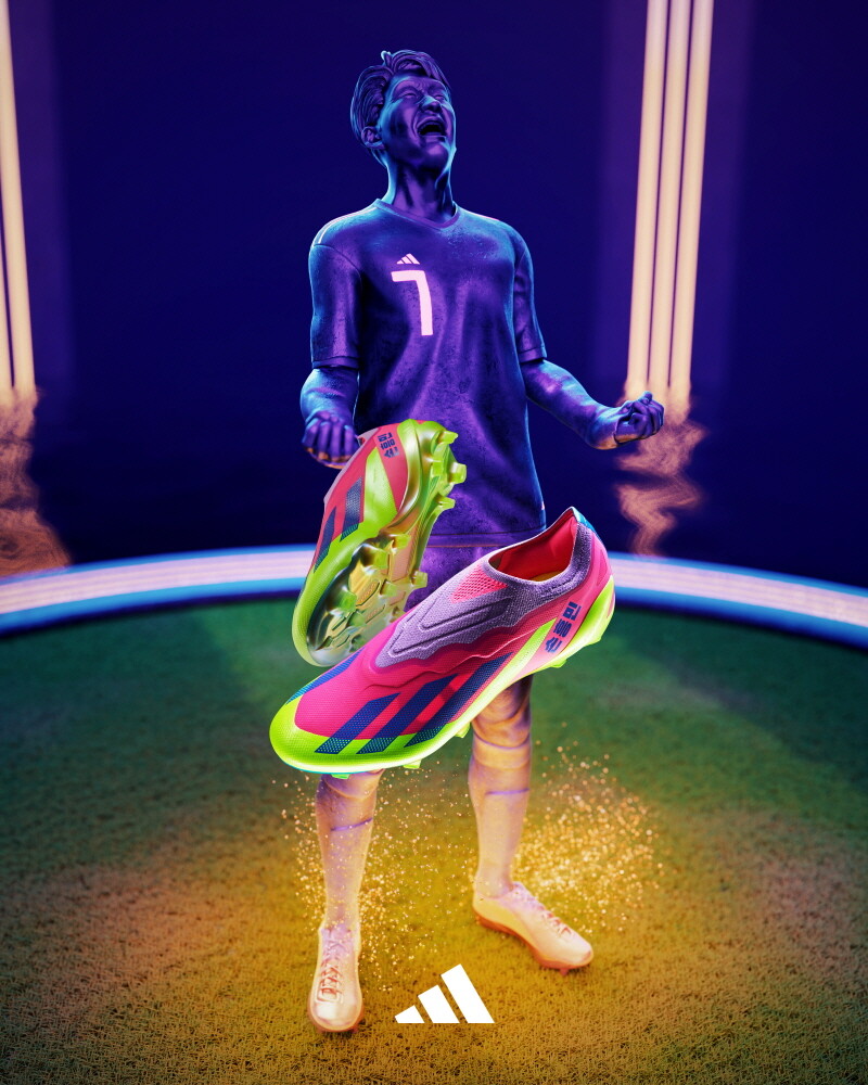 ‘X 크레이지패스트’를 재해석해 제작된 ‘손흥민 팩’은 서울의 야경에서 영감을 받은 강렬한 형광 노랑, 분홍, 보라빛 네온컬러가 신발 전면에 적용됐다. 또 측면에는 손흥민의 이름이 한글 정자로 새겨져 눈길을 끈다.